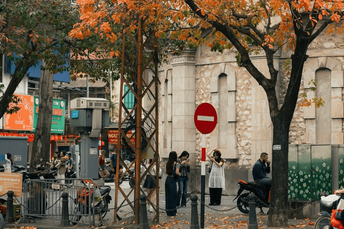 Một trong những điểm dừng chân đầu tiên cho hành trình tìm sắc hoa là khu vực Bốt Hàng Đậu. Công trình kiến trúc cổ nằm giữa nhiều tuyến phố lớn vốn đã quen thuộc với người Hà Nội, nhưng vào thời điểm tháng ba, nơi đây lại mang một vẻ đẹp rất riêng nhờ những cây lộc vừng đứng cạnh bốt nước.